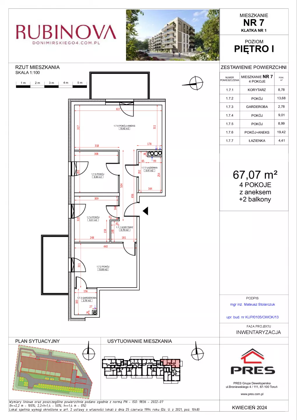 Udogodnienia: W najbliższej okolicy inwestycji RUBINOVA znajdują się 24 placówki edukacyjne. Nieopodal inwestycji znajduje się Struga Toruńska, która pozwoli przyszłym mieszkańcom regularnie spędzać czas na łonie natury. Alejki spacerowe oraz starannie zaprojektowana mała architektura i nastrojowe oświetlenie. Łatwy dostęp do miejskiej infrastruktury. Najbliżej położone to- przedszkole w odległości 50 m, Zespół Szkół nr 8 w odległości 200m. Liczne sklepy. Wyróżnik inwestycji: Rubinova to zaprojektowany ze smakiem, budynek o eleganckiej, ponadczasowej fasadzie. Jego największą zaletą jest kameralność. Bliskość terenów rekreacyjnych oraz obiektów sportowych to mocna strona tej lokalizacji. W najbliższej okolicy inwestycji RUBINOVA w odległości 100 m znajduje się bieżnia / tor, w odległości 100 m znajduje się siłownia na świeżym powietrzu, w odległości 200 m znajduje się boisko / kort. Przynależności: Wózkownie, komórki i schowki. Balkon w każdym mieszkaniu. Tarasy i ogródki. Siłownia na świeżym powietrzu, tężnia solankowa. Docelowo ma być boisko Orlik (koszykówka, piłka nożna).Altany wraz z grillem. Górka saneczkowa. Zielony tunel. Naturalny plac zabaw. Bezpieczeństwo: Drzwi antywłamaniowe o podwyższonej izolacji akustycznej. Wideodomofony, monitoring zewnętrzny i hali garażowej.. Wielkość Projektu: 1 budynek wielorodzinne 6-piętrowy. 73 mieszkań, podziemne hala garażowa. Komórki lokatorskie. Garaże: Na terenie inwestycji powstaną 71 podziemne miejsca postojowe. Komunikacja: W pobliżu projektu znajdują się bardzo blisko przystanki autobusowe i tramwajowe ok. 188m. PKP Toruń Wschodni 1,5km Odległość od Centrum: 3,4km (ok. 6min samochodem). Szczegóły: Wysokość pomieszczeń 2,6-2,8m. Standard deweloperski. Balkony szlichta. Rolety zewnętrzne. Ogródki dla mieszkań na parterze.