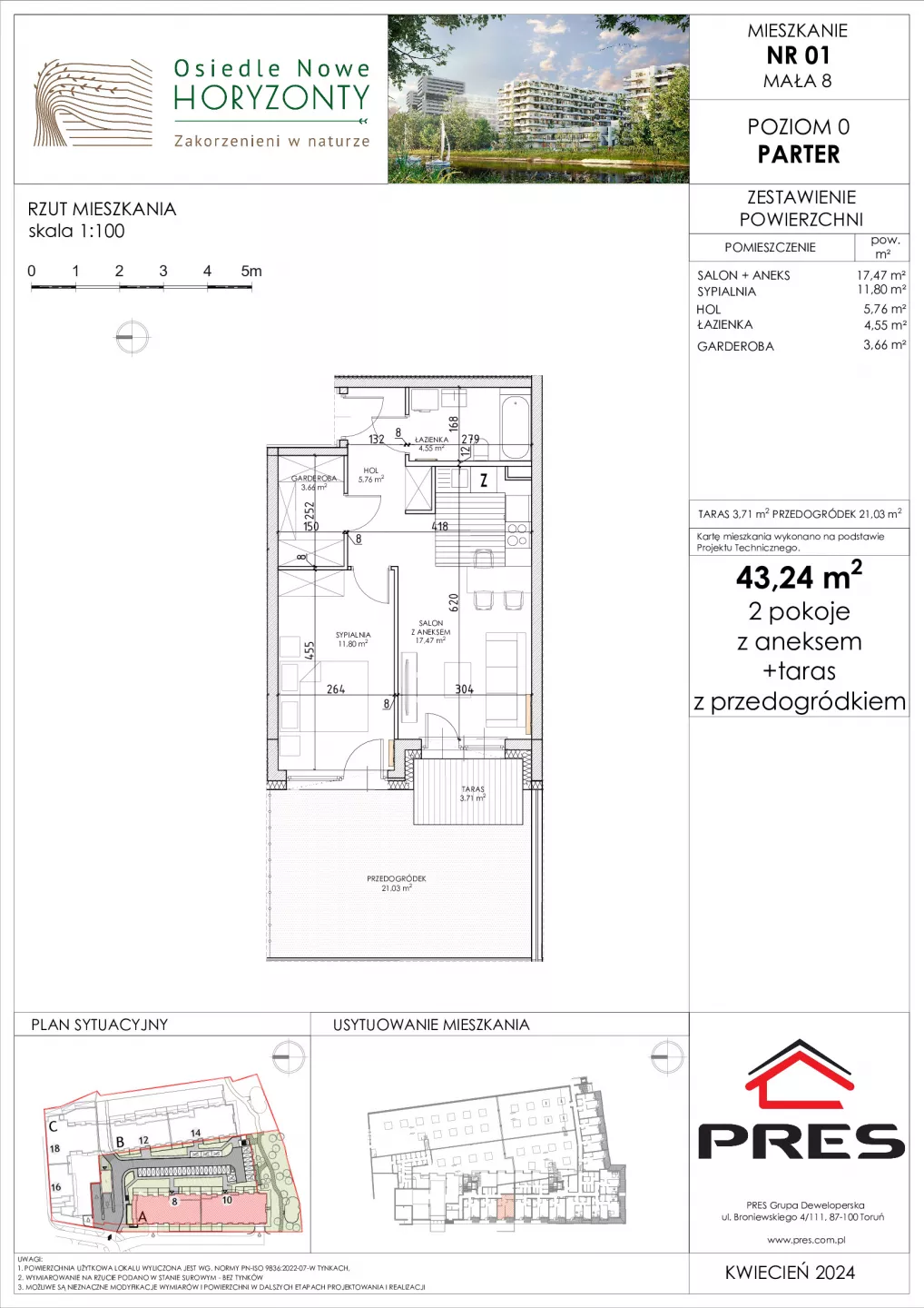 Udogodnienia: Nowe Horyzonty to innowacyjne rozwiązania m.in stacja zmiękczania wody, fotowoltaika na dachach zasilająca części wspólne, ekologiczne i automatyczne wykorzystanie wody deszczowej do podlewania, ograniczenie ruchu samochodowego na terenie osiedla (ok. 90% samochodów w halach garażowych podziemnych), stanowisko zewnętrzne do ładowania samochodów elektrycznych oraz możliwość doprowadzenia do każdego stanowiska instalacji do ładowania samochodów. Biedronka po drugiej stronie ulicy 207m, szkoła podstawowa, żłobek, przedszkole, park przy Balatonie, Fabryka Tańca.. Planowane prywatne przedszkole na terenie osiedla. Wyróżnik inwestycji: Lokalizacja blisko zieleni wraz z bulwarem tuż przy rzece Brdzie. Dobra okazja inwestycyjna pod najem długo-, jak i krótkoterminowy. Przynależności: Wózkownie, komórki i schowki. Balkon w każdym mieszkaniu. Tarasy i ogródki. Siłownia na świeżym powietrzu, tężnia solankowa. Docelowo ma być boisko Orlik (koszykówka, piłka nożna).Altany wraz z grillem. Górka saneczkowa. Zielony tunel. Naturalny plac zabaw. Bezpieczeństwo: Drzwi antywłamaniowe o podwyższonej izolacji akustycznej. Wideodomofony, monitoring zewnętrzny i hali garażowej.. Wielkość Projektu: 3 budynki wielorodzinne 7-piętrowe. I etap 149 mieszkań. Komórki lokatorskie. Garaże: Na terenie inwestycji powstaną 32 naziemne i 78 podziemne miejsca postojowe. Komunikacja: W pobliżu projektu znajdują się bardzo blisko przystanki autobusowe i tramwajowe. Dworzec PKS 4km, PKP Bydgoszcz Główna 5,2km Odległość od Centrum: 3,4km (ok. 6min samochodem). Szczegóły: Wysokość pomieszczeń 2,65m. Standard deweloperski.
