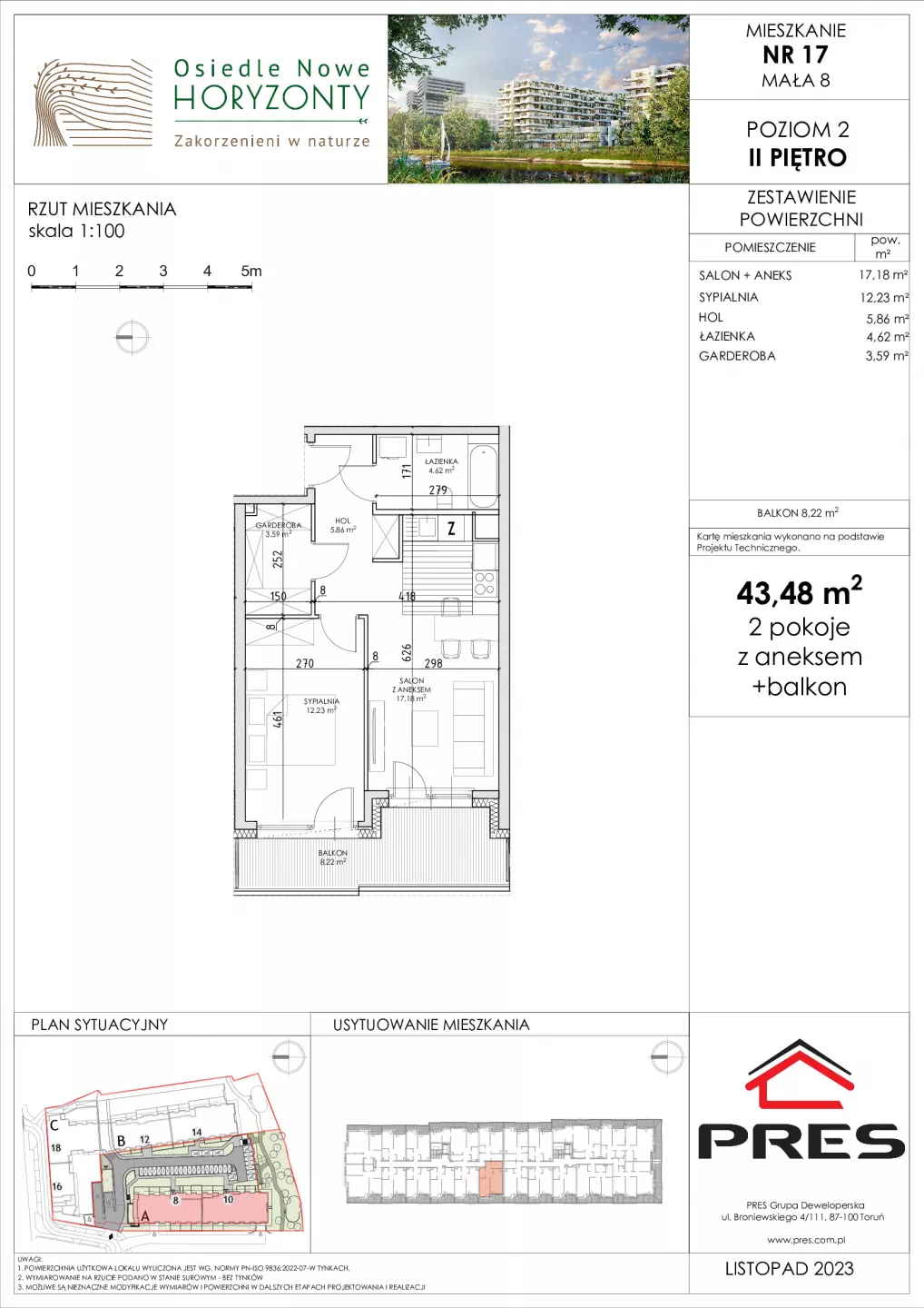 Udogodnienia: Nowe Horyzonty to innowacyjne rozwiązania m.in stacja zmiękczania wody, fotowoltaika na dachach zasilająca części wspólne, ekologiczne i automatyczne wykorzystanie wody deszczowej do podlewania, ograniczenie ruchu samochodowego na terenie osiedla (ok. 90% samochodów w halach garażowych podziemnych), stanowisko zewnętrzne do ładowania samochodów elektrycznych oraz możliwość doprowadzenia do każdego stanowiska instalacji do ładowania samochodów. Biedronka po drugiej stronie ulicy 207m, szkoła podstawowa, żłobek, przedszkole, park przy Balatonie, Fabryka Tańca.. Planowane prywatne przedszkole na terenie osiedla. Wyróżnik inwestycji: Lokalizacja blisko zieleni wraz z bulwarem tuż przy rzece Brdzie. Dobra okazja inwestycyjna pod najem długo-, jak i krótkoterminowy. Przynależności: Wózkownie, komórki i schowki. Balkon w każdym mieszkaniu. Tarasy i ogródki. Siłownia na świeżym powietrzu, tężnia solankowa. Docelowo ma być boisko Orlik (koszykówka, piłka nożna).Altany wraz z grillem. Górka saneczkowa. Zielony tunel. Naturalny plac zabaw. Bezpieczeństwo: Drzwi antywłamaniowe o podwyższonej izolacji akustycznej. Wideodomofony, monitoring zewnętrzny i hali garażowej.. Wielkość Projektu: 3 budynki wielorodzinne 7-piętrowe. I etap 149 mieszkań. Komórki lokatorskie. Garaże: Na terenie inwestycji powstaną 32 naziemne i 78 podziemne miejsca postojowe. Komunikacja: W pobliżu projektu znajdują się bardzo blisko przystanki autobusowe i tramwajowe. Dworzec PKS 4km, PKP Bydgoszcz Główna 5,2km Odległość od Centrum: 3,4km (ok. 6min samochodem). Szczegóły: Wysokość pomieszczeń 2,65m. Standard deweloperski.