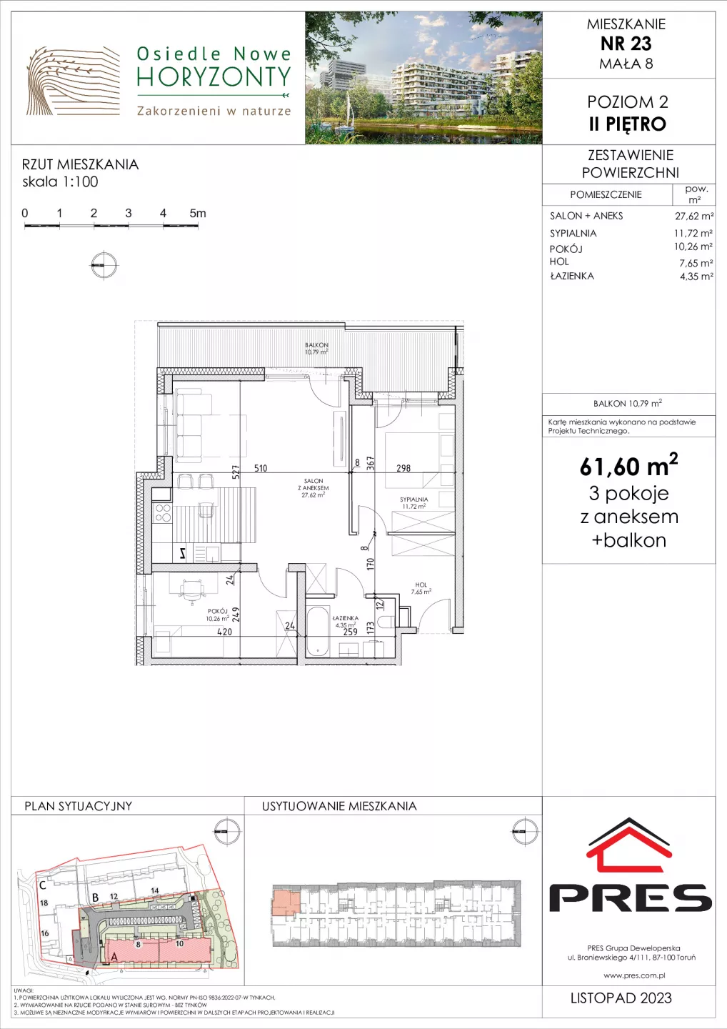Udogodnienia: Nowe Horyzonty to innowacyjne rozwiązania m.in stacja zmiękczania wody, fotowoltaika na dachach zasilająca części wspólne, ekologiczne i automatyczne wykorzystanie wody deszczowej do podlewania, ograniczenie ruchu samochodowego na terenie osiedla (ok. 90% samochodów w halach garażowych podziemnych), stanowisko zewnętrzne do ładowania samochodów elektrycznych oraz możliwość doprowadzenia do każdego stanowiska instalacji do ładowania samochodów. Biedronka po drugiej stronie ulicy 207m, szkoła podstawowa, żłobek, przedszkole, park przy Balatonie, Fabryka Tańca.. Planowane prywatne przedszkole na terenie osiedla. Wyróżnik inwestycji: Lokalizacja blisko zieleni wraz z bulwarem tuż przy rzece Brdzie. Dobra okazja inwestycyjna pod najem długo-, jak i krótkoterminowy. Przynależności: Wózkownie, komórki i schowki. Balkon w każdym mieszkaniu. Tarasy i ogródki. Siłownia na świeżym powietrzu, tężnia solankowa. Docelowo ma być boisko Orlik (koszykówka, piłka nożna).Altany wraz z grillem. Górka saneczkowa. Zielony tunel. Naturalny plac zabaw. Bezpieczeństwo: Drzwi antywłamaniowe o podwyższonej izolacji akustycznej. Wideodomofony, monitoring zewnętrzny i hali garażowej.. Wielkość Projektu: 3 budynki wielorodzinne 7-piętrowe. I etap 149 mieszkań. Komórki lokatorskie. Garaże: Na terenie inwestycji powstaną 32 naziemne i 78 podziemne miejsca postojowe. Komunikacja: W pobliżu projektu znajdują się bardzo blisko przystanki autobusowe i tramwajowe. Dworzec PKS 4km, PKP Bydgoszcz Główna 5,2km Odległość od Centrum: 3,4km (ok. 6min samochodem). Szczegóły: Wysokość pomieszczeń 2,65m. Standard deweloperski.