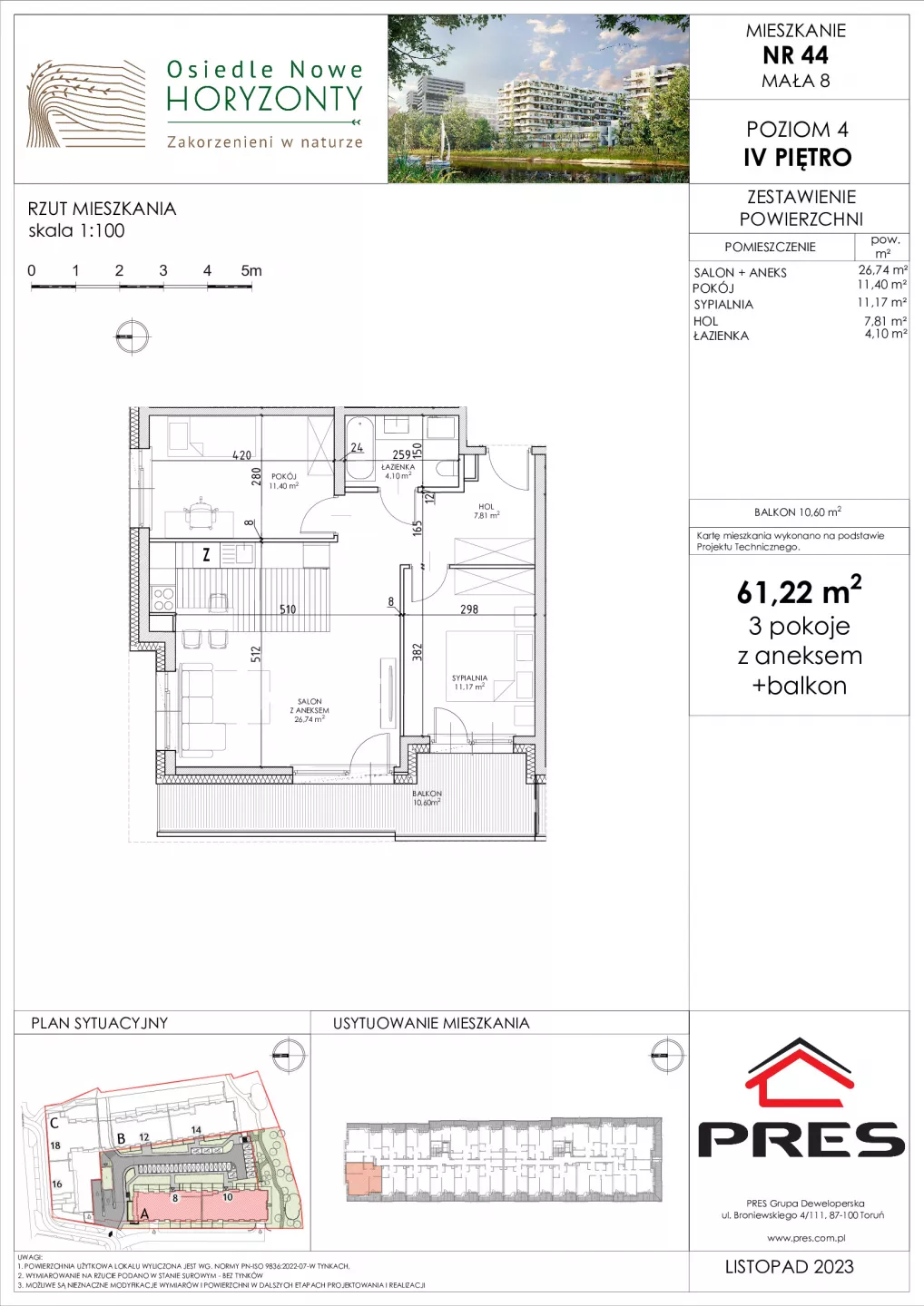 Udogodnienia: Nowe Horyzonty to innowacyjne rozwiązania m.in stacja zmiękczania wody, fotowoltaika na dachach zasilająca części wspólne, ekologiczne i automatyczne wykorzystanie wody deszczowej do podlewania, ograniczenie ruchu samochodowego na terenie osiedla (ok. 90% samochodów w halach garażowych podziemnych), stanowisko zewnętrzne do ładowania samochodów elektrycznych oraz możliwość doprowadzenia do każdego stanowiska instalacji do ładowania samochodów. Biedronka po drugiej stronie ulicy 207m, szkoła podstawowa, żłobek, przedszkole, park przy Balatonie, Fabryka Tańca.. Planowane prywatne przedszkole na terenie osiedla. Wyróżnik inwestycji: Lokalizacja blisko zieleni wraz z bulwarem tuż przy rzece Brdzie. Dobra okazja inwestycyjna pod najem długo-, jak i krótkoterminowy. Przynależności: Wózkownie, komórki i schowki. Balkon w każdym mieszkaniu. Tarasy i ogródki. Siłownia na świeżym powietrzu, tężnia solankowa. Docelowo ma być boisko Orlik (koszykówka, piłka nożna).Altany wraz z grillem. Górka saneczkowa. Zielony tunel. Naturalny plac zabaw. Bezpieczeństwo: Drzwi antywłamaniowe o podwyższonej izolacji akustycznej. Wideodomofony, monitoring zewnętrzny i hali garażowej.. Wielkość Projektu: 3 budynki wielorodzinne 7-piętrowe. I etap 149 mieszkań. Komórki lokatorskie. Garaże: Na terenie inwestycji powstaną 32 naziemne i 78 podziemne miejsca postojowe. Komunikacja: W pobliżu projektu znajdują się bardzo blisko przystanki autobusowe i tramwajowe. Dworzec PKS 4km, PKP Bydgoszcz Główna 5,2km Odległość od Centrum: 3,4km (ok. 6min samochodem). Szczegóły: Wysokość pomieszczeń 2,65m. Standard deweloperski.