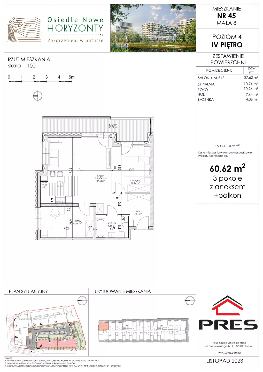 Udogodnienia: Nowe Horyzonty to innowacyjne rozwiązania m.in stacja zmiękczania wody, fotowoltaika na dachach zasilająca części wspólne, ekologiczne i automatyczne wykorzystanie wody deszczowej do podlewania, ograniczenie ruchu samochodowego na terenie osiedla (ok. 90% samochodów w halach garażowych podziemnych), stanowisko zewnętrzne do ładowania samochodów elektrycznych oraz możliwość doprowadzenia do każdego stanowiska instalacji do ładowania samochodów. Biedronka po drugiej stronie ulicy 207m, szkoła podstawowa, żłobek, przedszkole, park przy Balatonie, Fabryka Tańca.. Planowane prywatne przedszkole na terenie osiedla. Wyróżnik inwestycji: Lokalizacja blisko zieleni wraz z bulwarem tuż przy rzece Brdzie. Dobra okazja inwestycyjna pod najem długo-, jak i krótkoterminowy. Przynależności: Wózkownie, komórki i schowki. Balkon w każdym mieszkaniu. Tarasy i ogródki. Siłownia na świeżym powietrzu, tężnia solankowa. Docelowo ma być boisko Orlik (koszykówka, piłka nożna).Altany wraz z grillem. Górka saneczkowa. Zielony tunel. Naturalny plac zabaw. Bezpieczeństwo: Drzwi antywłamaniowe o podwyższonej izolacji akustycznej. Wideodomofony, monitoring zewnętrzny i hali garażowej.. Wielkość Projektu: 3 budynki wielorodzinne 7-piętrowe. I etap 149 mieszkań. Komórki lokatorskie. Garaże: Na terenie inwestycji powstaną 32 naziemne i 78 podziemne miejsca postojowe. Komunikacja: W pobliżu projektu znajdują się bardzo blisko przystanki autobusowe i tramwajowe. Dworzec PKS 4km, PKP Bydgoszcz Główna 5,2km Odległość od Centrum: 3,4km (ok. 6min samochodem). Szczegóły: Wysokość pomieszczeń 2,65m. Standard deweloperski.