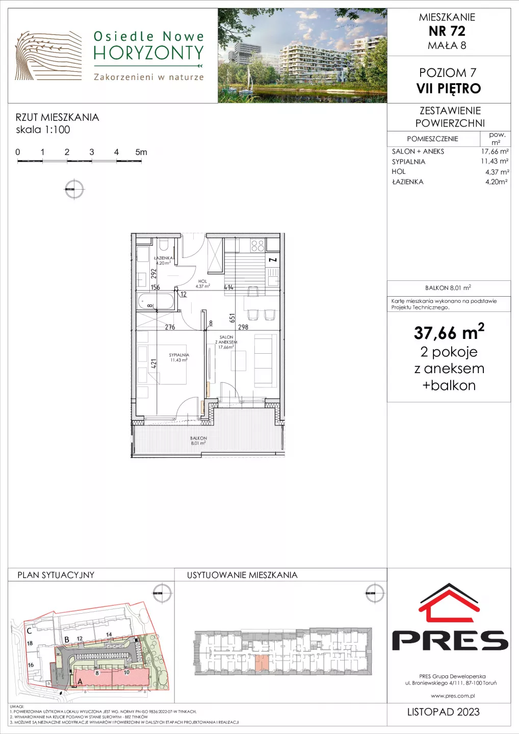Udogodnienia: Nowe Horyzonty to innowacyjne rozwiązania m.in stacja zmiękczania wody, fotowoltaika na dachach zasilająca części wspólne, ekologiczne i automatyczne wykorzystanie wody deszczowej do podlewania, ograniczenie ruchu samochodowego na terenie osiedla (ok. 90% samochodów w halach garażowych podziemnych), stanowisko zewnętrzne do ładowania samochodów elektrycznych oraz możliwość doprowadzenia do każdego stanowiska instalacji do ładowania samochodów. Biedronka po drugiej stronie ulicy 207m, szkoła podstawowa, żłobek, przedszkole, park przy Balatonie, Fabryka Tańca.. Planowane prywatne przedszkole na terenie osiedla. Wyróżnik inwestycji: Lokalizacja blisko zieleni wraz z bulwarem tuż przy rzece Brdzie. Dobra okazja inwestycyjna pod najem długo-, jak i krótkoterminowy. Przynależności: Wózkownie, komórki i schowki. Balkon w każdym mieszkaniu. Tarasy i ogródki. Siłownia na świeżym powietrzu, tężnia solankowa. Docelowo ma być boisko Orlik (koszykówka, piłka nożna).Altany wraz z grillem. Górka saneczkowa. Zielony tunel. Naturalny plac zabaw. Bezpieczeństwo: Drzwi antywłamaniowe o podwyższonej izolacji akustycznej. Wideodomofony, monitoring zewnętrzny i hali garażowej.. Wielkość Projektu: 3 budynki wielorodzinne 7-piętrowe. I etap 149 mieszkań. Komórki lokatorskie. Garaże: Na terenie inwestycji powstaną 32 naziemne i 78 podziemne miejsca postojowe. Komunikacja: W pobliżu projektu znajdują się bardzo blisko przystanki autobusowe i tramwajowe. Dworzec PKS 4km, PKP Bydgoszcz Główna 5,2km Odległość od Centrum: 3,4km (ok. 6min samochodem). Szczegóły: Wysokość pomieszczeń 2,65m. Standard deweloperski.