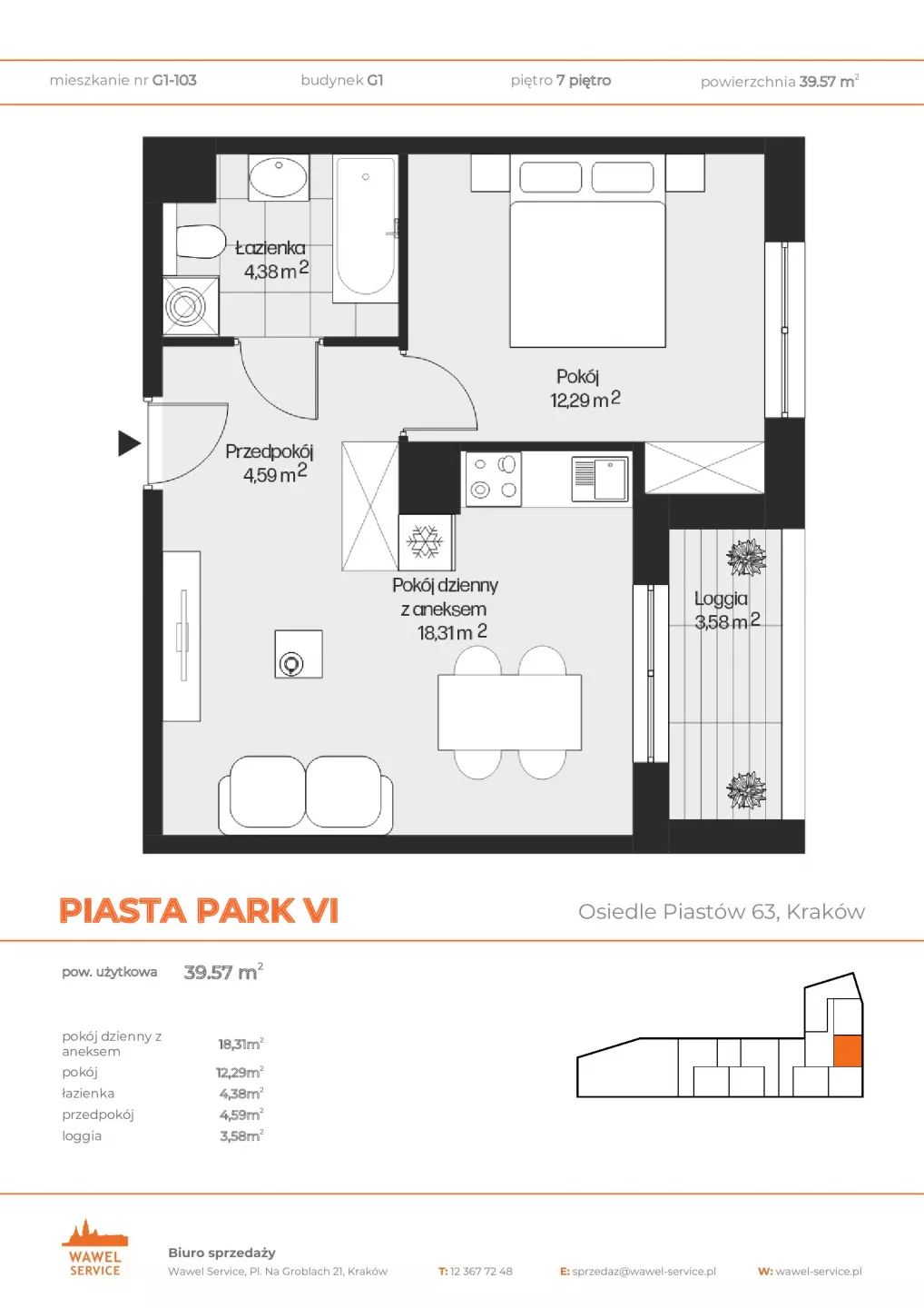 Udogodnienia: rowerownia, wózkownia, nowoczesna architektura, tereny zielone - Planty Mistrzejowickie, blisko komunikacji i centrum; w pobliżu znajduje się pełna infrastruktura - przedszkola; szkoły; galerie handlowe i punkty usługowe; restauracje; obiekty sportowe i rekreacyjne, cicha i spokojna okolica Przynależności: ogródek, loggia, komórka lokatorska Bezpieczeństwo: drzwi antywłamaniowe, domofon Wielkość Projektu: 118 mieszkań Garaże: Na terenie inwestycji znajduje się 83 miejsc postojowych w garażu i 2 miejsca postojowe naziemne Komunikacja: pętla autobusowa 100 m, tramwaj 400 m, stacja kolejowa 1,2 km Odległość od Centrum: 8,4 km