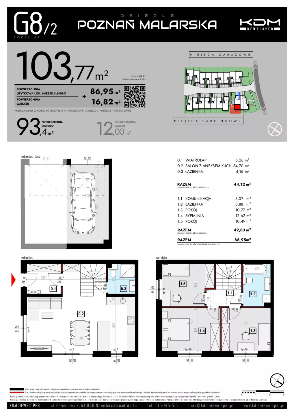 Udogodnienia: Plac zabaw, strefa zieleni, strefa komercyjna, strefa sportowa Przynależności: Każde mieszkanie posiada balkon. Bezpieczeństwo: Drogi wewnętrzne jednokierunkowe, progi zwalniające Wielkość Projektu: Inwestycja składa się z 32 mieszkań w zabudowie szeregowej i 4 mieszkań w zabudowie bliźniaczej. Garaże: W inwestycji będą dostępne miejsca postojowe. Komunikacja: Autobus 1,5 km Odległość od Centrum: Szczytniki 5,5 km; Poznań 16,6 km