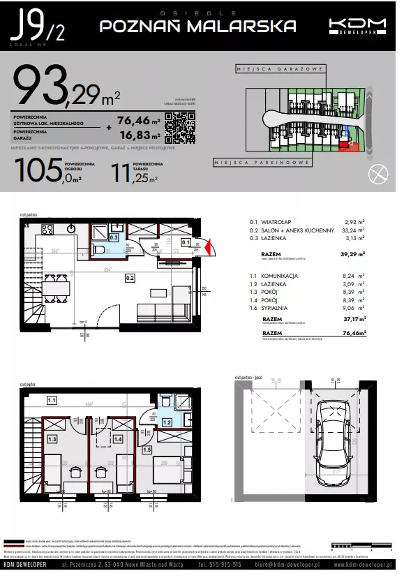 Udogodnienia: Plac zabaw, strefa zieleni, strefa komercyjna, strefa sportowa Przynależności: Każde mieszkanie posiada balkon. Bezpieczeństwo: Drogi wewnętrzne jednokierunkowe, progi zwalniające Wielkość Projektu: Inwestycja składa się z 32 mieszkań w zabudowie szeregowej i 4 mieszkań w zabudowie bliźniaczej. Garaże: W inwestycji będą dostępne miejsca postojowe. Komunikacja: Autobus 1,5 km Odległość od Centrum: Szczytniki 5,5 km; Poznań 16,6 km