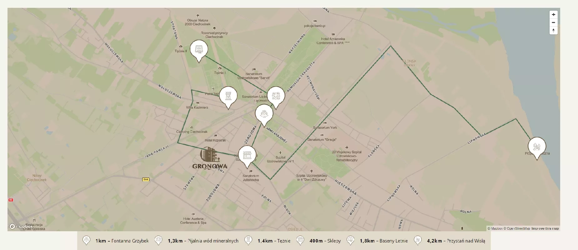 Udogodnienia: Kameralny mały budynek w typie modernistycznej kamienicy, wysoki standard części wspólnych. Rozwiązania EKO - LED i panele fotowoltaiczne. Nowoczesne windy. W pobliżu tereny zielone. Inwestycja Gronowa zlokalizowana jest w Ciechocinku, który jest usytuowany praktycznie przy wjeździe na autostradę A1, dzięki czemu jest to idealne miejsce na dalsze podróże. Przynależności: Każde mieszkanie posiada balkon. Mieszkania na parterze ogródki. Bezpieczeństwo: Domofon, drzwi antywłamaniowe Wielkość Projektu: Inwestycja składa się z 1 budynku wielorodzinnego 2 piętrowego, 1 podziemna hala garażowa na 50 miejsc parkingowych, 2 windy, 100 lokali mieszkalnych, komórek lokatorskich Garaże: 20 miejsc w hali garażowej (poziom -1 ), 30szt miejsc naziemnych Komunikacja: Dworzec Autobusowy 800m- pieszo 10min. Dworzec PKP Ciechocinek 1.4km - 13min pieszo Odległość od Centrum: centrum UWAGI: NIE KORZYSTAĆ Z WIZUALIZACJI DEWELOPERA - SKORZYSTAJ Z ZDJĘĆ WYKOŃCZONYCH LOKALI