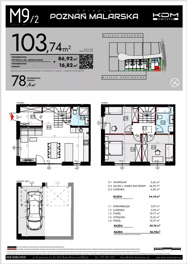 Udogodnienia: Plac zabaw, strefa zieleni, strefa komercyjna, strefa sportowa Przynależności: Każde mieszkanie posiada balkon. Bezpieczeństwo: Drogi wewnętrzne jednokierunkowe, progi zwalniające Wielkość Projektu: Inwestycja składa się z 18 mieszkań w zabudowie szeregowej i 4 mieszkań w zabudowie bliźniaczej. Garaże: W inwestycji będą dostępne miejsca postojowe. Komunikacja: Autobus 1,5 km Odległość od Centrum: Szczytniki 5,5 km; Poznań 16,6 km