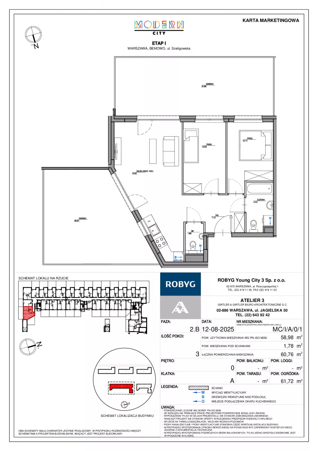 Bemowo to innowacyjna, dynamicznie rozwijająca się dzielnica, chętnie wybierana na miejsce do życia. Ludzi przyciąga tu bogata oferta usług społecznych i kulturalnych, piękna zieleń, nowoczesne rozwiązania oraz doskonałe połączenia komunikacyjne. Właśnie dlatego od lat tworzymy tu nowoczesne, przyjazne mieszkańcom osiedla. W okolicy ulic Batalionów Chłopskich i Szeligowskiej wybudowaliśmy już 1500 mieszkań i byliśmy pionierem zagospodarowania tej części dzielnicy. Obecnie realizujemy projekt Modern City, w ramach którego powstanie łącznie ok. 800 funkcjonalnych apartamentów i mieszkań na sprzedaż. Do mieszkań przynależeć będą duże balkony, loggie lub ogródki. Cechą charakterystyczną osiedla jest ciekawa, modernistyczna architektura, eleganckie białe elewacje z elementami klinkieru, części wspólne indywidualnie zaprojektowane z materiałów wysokiej jakości. Wewnątrz osiedla powstanie rozległy park z elementami małej architektury, ścieżką rowerową, placem zabaw, strefą relaksu i siłownią plenerową wyposażoną w urządzenia do street workoutu. Każde mieszkanie, bez dodatkowych opłat, zostanie wyposażone w system Smart House - inteligentny dom. Komórka lokatorska możliwa od 39m2