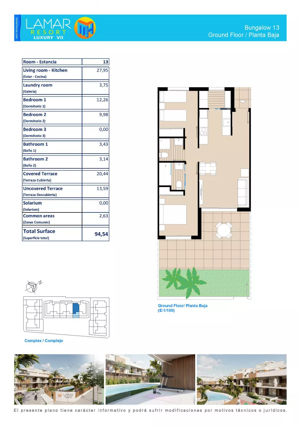 Opis: LAMAR Resort Luxury VII to luksusowy kompleks 34 apartamentów z 2/3 sypialniami i 2 łazienkami, rozmieszczony w 3 blokach z basenem, jacuzzi, siłownią, placem zabaw i garażem z pomieszczeniami gospodarczymi. Partery posiadają duże ogrody, pierwsze piętra oferują tarasy, a penthousy posiadają solarium z jacuzzi. Udogodnienia: Łazienki i kuchnia wyposażone. Ogrzewanie podłogowe w łazienkach. Przynależności: Miejsce postojowe w podziemnej hali garażowej, komórka lokatorska. Ogród lub solarium z zależności od modelu Bezpieczeństwo: Drzwi antywłamaniowe, ogrodzenie. Wielkość Projektu: 3 bloki mieszkalne Garaże: Miejsce w hali garażowej Komunikacja: 76 km do lotniska Alicante - Elche Odległość od morza: 2 km