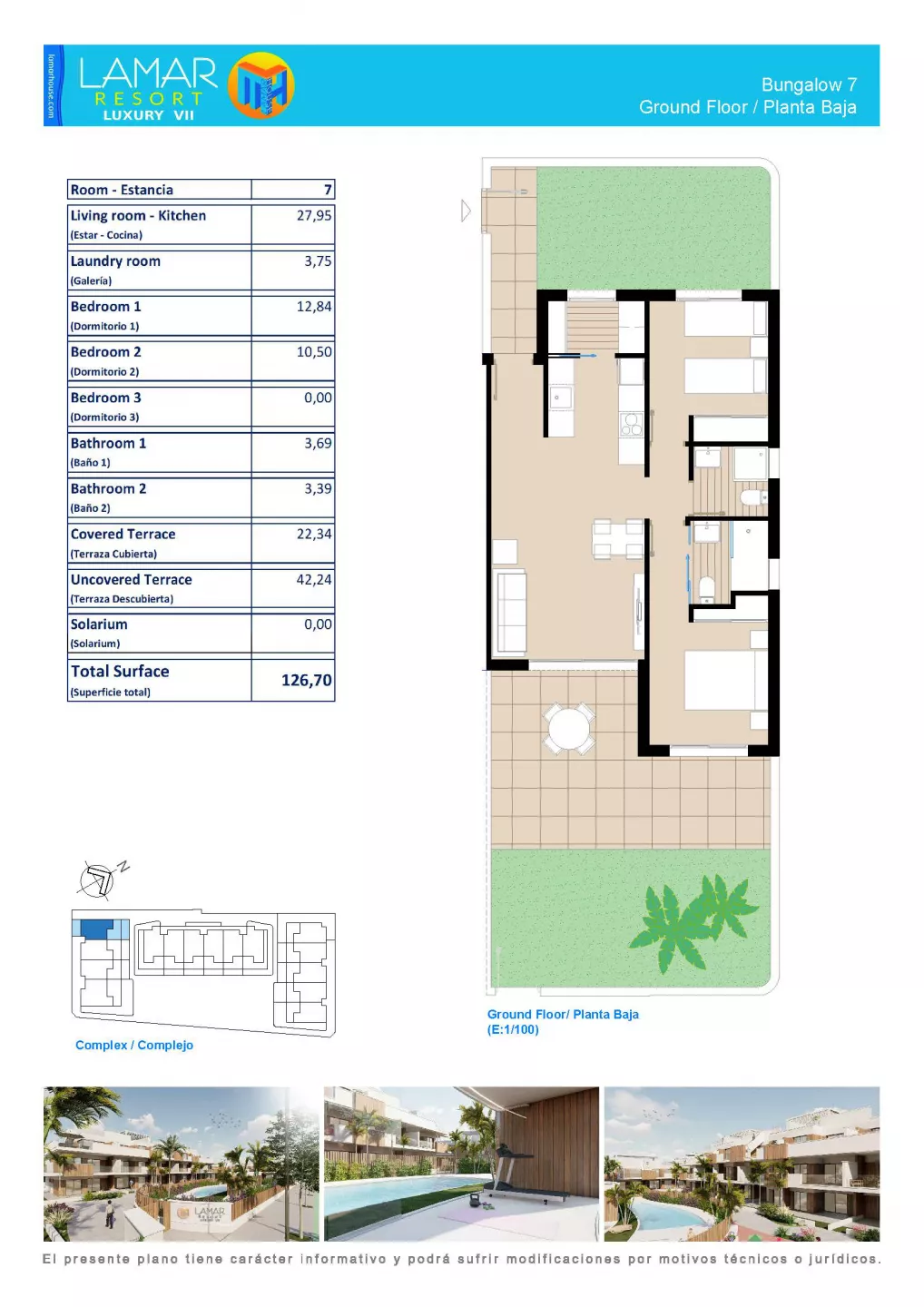 Opis: LAMAR Resort Luxury VII to luksusowy kompleks 34 apartamentów z 2/3 sypialniami i 2 łazienkami, rozmieszczony w 3 blokach z basenem, jacuzzi, siłownią, placem zabaw i garażem z pomieszczeniami gospodarczymi. Partery posiadają duże ogrody, pierwsze piętra oferują tarasy, a penthousy posiadają solarium z jacuzzi. Udogodnienia: Łazienki i kuchnia wyposażone. Ogrzewanie podłogowe w łazienkach. Przynależności: Miejsce postojowe w podziemnej hali garażowej, komórka lokatorska. Ogród lub solarium z zależności od modelu Bezpieczeństwo: Drzwi antywłamaniowe, ogrodzenie. Wielkość Projektu: 3 bloki mieszkalne Garaże: Miejsce w hali garażowej Komunikacja: 76 km do lotniska Alicante - Elche Odległość od morza: 2 km