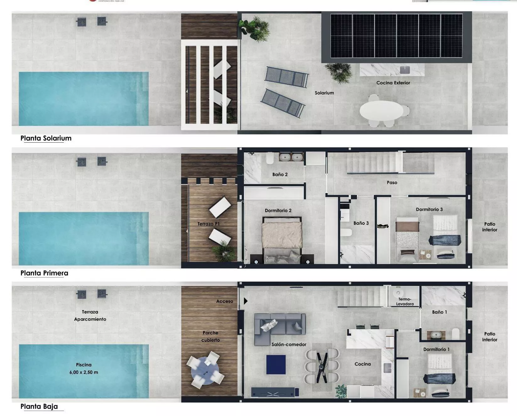 OPIS: Kompleks zaledwie 8 willi jednorodzinnych, zaprojektowanych z myślą o najwyższych standardach. Każda z nich oferuje wyjątkowe udogodnienia: prywatny basen, idealny do orzeźwienia w gorące dni, przestronne solarium z letnią kuchnią, gdzie możesz cieszyć się słońcem i spędzać czas z bliskimi, energooszczędne rozwiązania, takie jak instalacja fotowoltaiczna (6 paneli o mocy 550W), aerotermia i system wentylacji mechanicznej, które obniżają koszty utrzymania domu, inteligentny system zarządzania (domotyka), pozwalający na kontrolę rolet, basenu, oświetlenia i klimatyzacji, wysokiej jakości wykończenia, w tym porcelanowe płytki, elegancka stolarka (PCV, drzwi wejściowe antywłamaniowe), lakierowane szafy w zabudowie i markowe sprzęty AGD (Siemens lub podobne). Udogodnienia: Kuchnia i łazienki w pełni umeblowane i wyposażone, instalacja fotowoltaiczna, preinstalacja do klimatyzacji kanałowej Przynależności: Prywatny basen, Bezpieczeństwo: Drzwi i rolety antywłamaniowe Wielkość Projektu: 8 willi Garaże: Miejsce parkingowe na posesji Komunikacja: 60 km do lotniska Alicante Odległość od morza: 2,5 km
