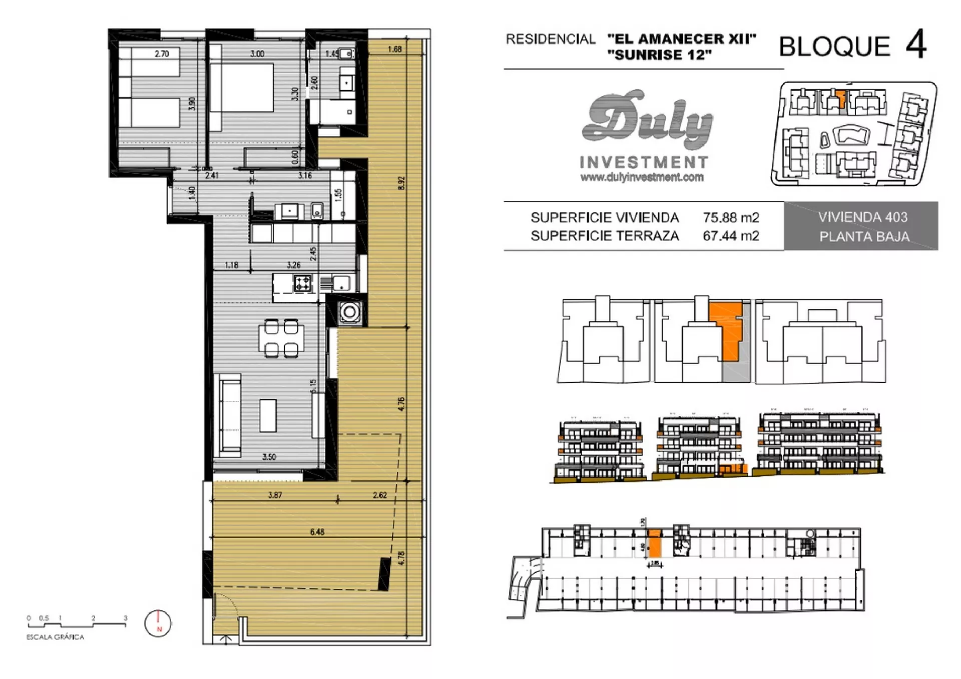 OPIS: Inwestycja Amanecer XII to obiźniacze siedle z Amanecer XI, obejmuje 112 apartamentów z dwoma sypialniami i dwoma łazienkami, ze słonecznymi tarasami, wspólnym basenem, siłownią, sauną, jacuzzi, placem zabaw dla dzieci. Inwestycja zlokalizowana jest w niewielkiej odległości od morza i znanych w Europie pół golfowych. Udogodnienia: Kuchnia umeblowan i wyposażona, łazienki w pełni wyposażone , klimatyzacja (ciepło/zimno), kompletny pakiet mebli, małe AGD, Smart TV 43 LED HD WIFI Przynależności: Basen, siłownia, sauna, strefa dla dzieci, Bezpieczeństwo: Zamknięte osiedle Wielkość Projektu: 112 apartamentów Garaże: miejsce w hali parkingowej wraz z komórką lokatorską Komunikacja: 45 km do lotniska Alicante Odległość od morza: 3 km