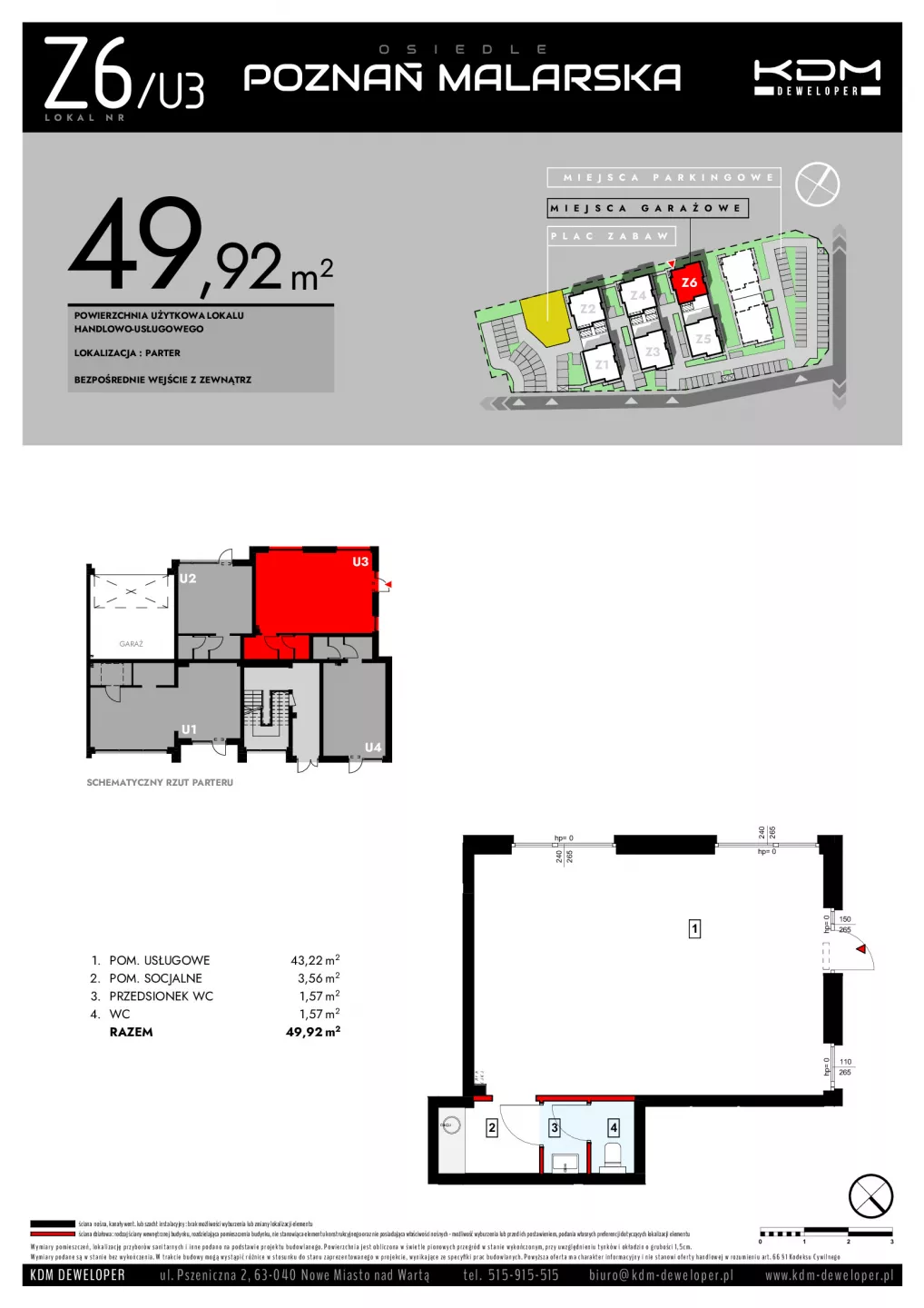 Udogodnienia: Plac zabaw, strefa zieleni, strefa komercyjna, strefa sportowa Bezpieczeństwo: Drogi wewnętrzne jednokierunkowe, progi zwalniające Wielkość Projektu: 18 lokali usługowych Garaże: W inwestycji będą dostępne miejsca postojowe. Komunikacja: Autobus 1,5 km Odległość od Centrum: Szczytniki 5,5 km; Poznań 16,6 km